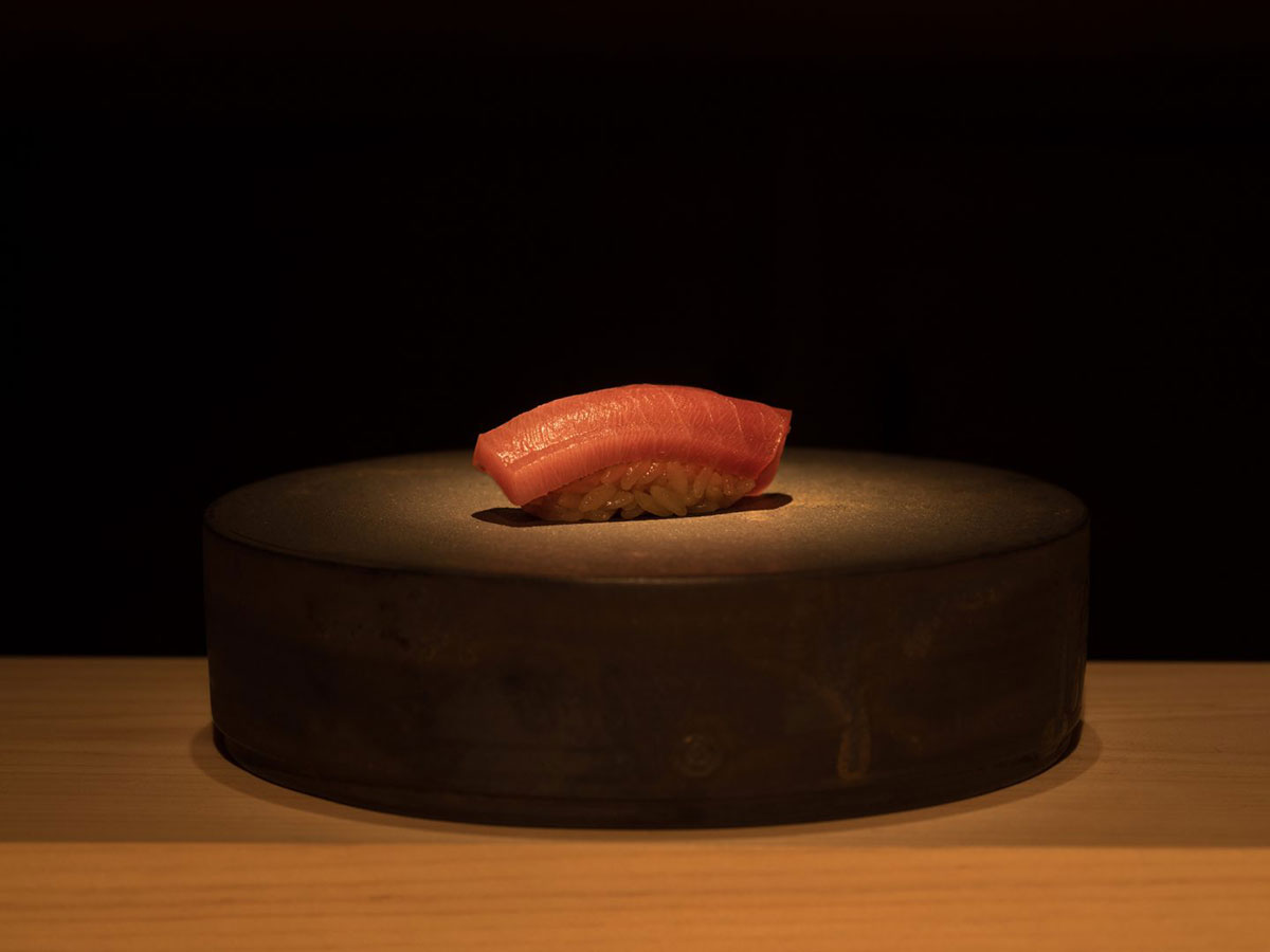 In the main dining room, beneath a ceiling woven from black bamboo and Japanese cedar, rests a hinoki counter, masterfully crafted from a single tree. The table top, made from a 2500-year-old jindai sugi (lignitised Japanese cedar) harvested from the volcanic remnants of Mt. Chokai in Yamagata, intertwines the present with the past. Luxurious yet understated, the restaurant’s exclusive interior is designed to spotlight pure, classic Edomae sushi at its finest.